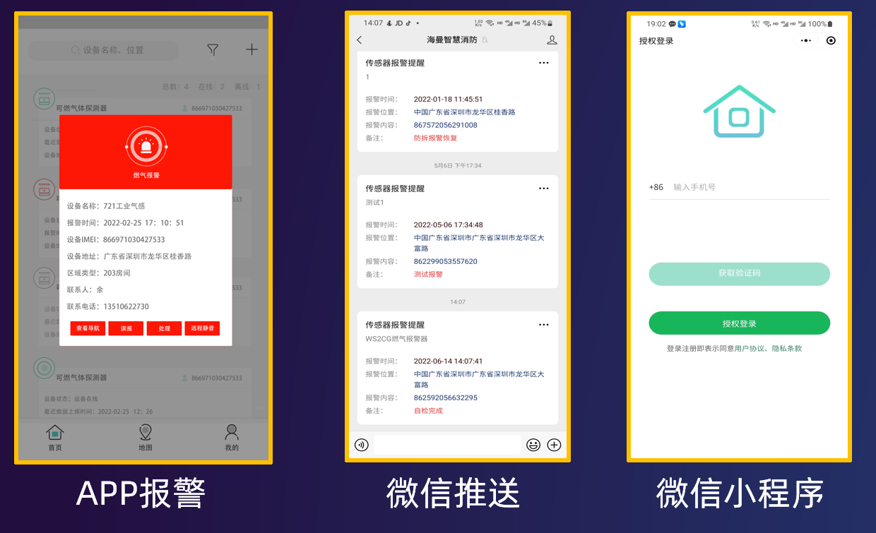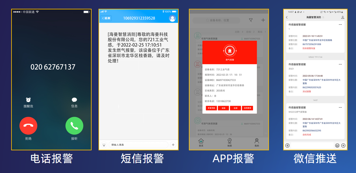 設(shè)備監(jiān)測(cè)到氣體泄露后,會(huì)同時(shí)通過(guò)平臺(tái)彈窗、平臺(tái)警報(bào)聲、電話、短信、APP報(bào)警、微信推送方式通知用戶,而且電話可以同時(shí)分享給多人,把報(bào)警信息通知給安全負(fù)責(zé)人以及用戶端。
